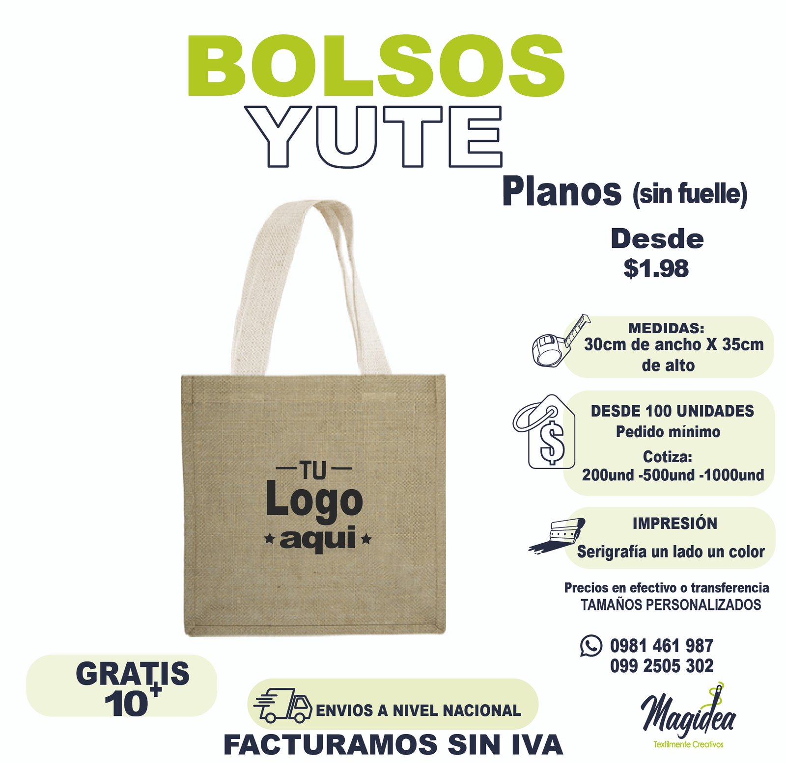¡Stock limitado en bolsos rebajados! Las mejores ofertas se agotan rápido. Cantidades mínimas reducidas en productos seleccionados. Envíos a todo Ecuador con las mismas garantías de calidad. Consulta disponibilidad de colores y modelos. ¡Cotiza ahora y aprovecha nuestros precios de oferta en bolsos ecológicos premium!